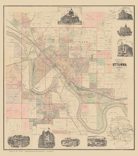 Ottumwa Iowa 1893 Old Map Reprint Landowners Names IA Cities